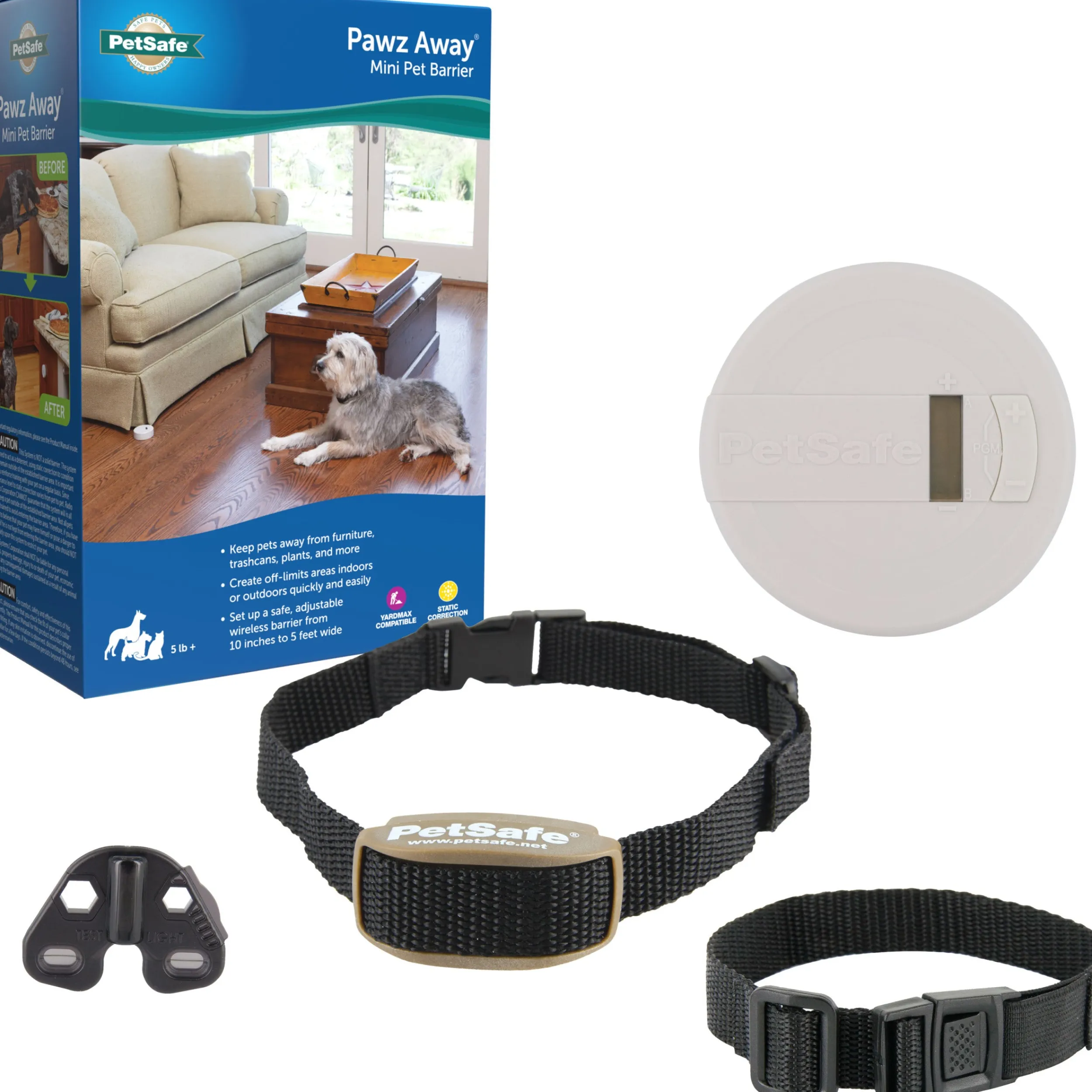 Prevent your dog from digging in the flower beds outside and from sneaking food from the trash can inside with the PetSafe® Pawz Away® Mini Pet Barrier. With the help of this indoor/outdoor pet barrier, easily teach your cat or dog which areas around your home are off-limits. This training tool is easy to use, simply place the pet barrier in the spot you’d like your best friend to avoid and secure the adjustable receiver collar around your pet’s neck. When your pet enters the pet-free zone, they will first hear a series of beeps from the receiver collar. If they do not leave the area, they will then feel a safe yet startling static correction. If your pet remains in the correction area for more than 15 seconds, the receiver collar will automatically shut off. With a little time and practice, your pet will soon learn the areas of the home they need to avoid. If you have more than one place in your home that you would like your cat or dog to stay away from, simply purchase as many additional Pawz Away® Pet Barriers as desired. Your pet deserves the best. Trust PetSafe® to help keep your pet healthy, safe and happy.