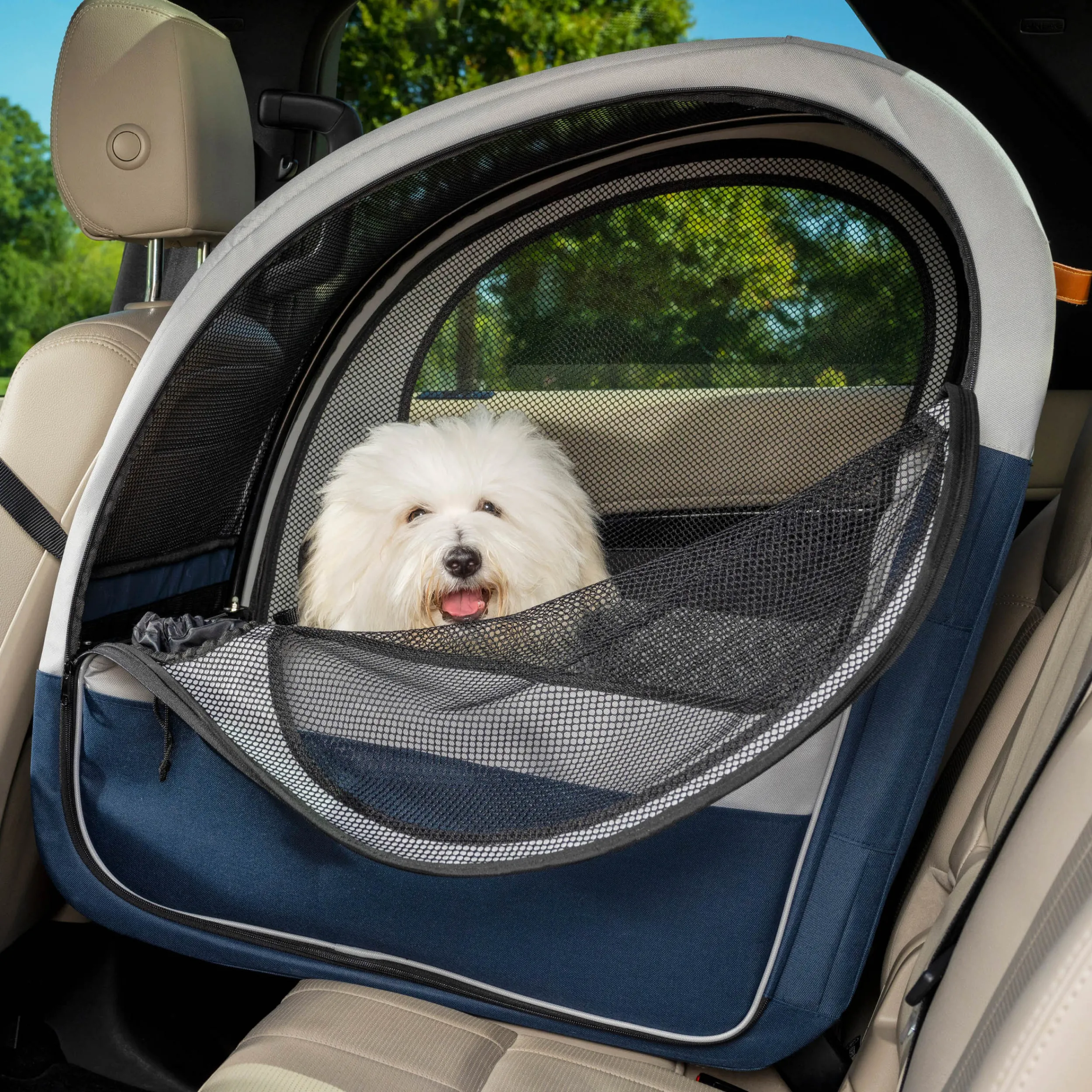 This car crate has 2 doors that fully unzip to help you easily get your pet in and out of the car, whether the crate is behind the driver’s seat or the passenger’s seat. The crate also has 2 storage pockets with a hook and loop closure to keep your dog’s leash, poop bags and treats packed and tidy while on the road. There are 2 drawstring openings, one on each side of the travel crate, so you can reach in to give your dog an extra pet (or treat) without unzipping the door.