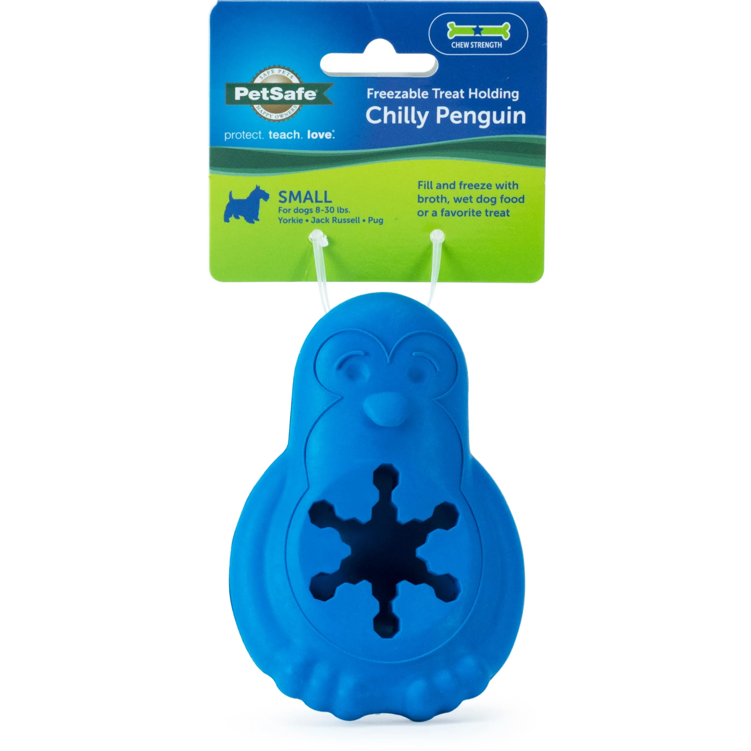 Give your dog a cool treat anytime with the PetSafe® Freezable Treat Holding Chilly Penguin toy. Fill the center of the Chilly Penguin with freezable treats like flavored water, chicken broth, yogurt or wet dog food. Place the Chilly Penguin in your freezer overnight and your pooch will have a delicious frozen delight to enjoy the next day. If your dog needs to reach the yummy treat faster, try trimming the snowflake points. Once the points are cut, there is no going back so we recommend trimming only a little at a time and then testing. The rounded base gives the Chilly Penguin a fun and challenging wobble. Stack multiple Chilly Penguins on top of one another to save on freezer space. Once your dog is satisfied, the Chilly Penguin toy can be easily cleaned by putting it in the top rack of your dishwasher.