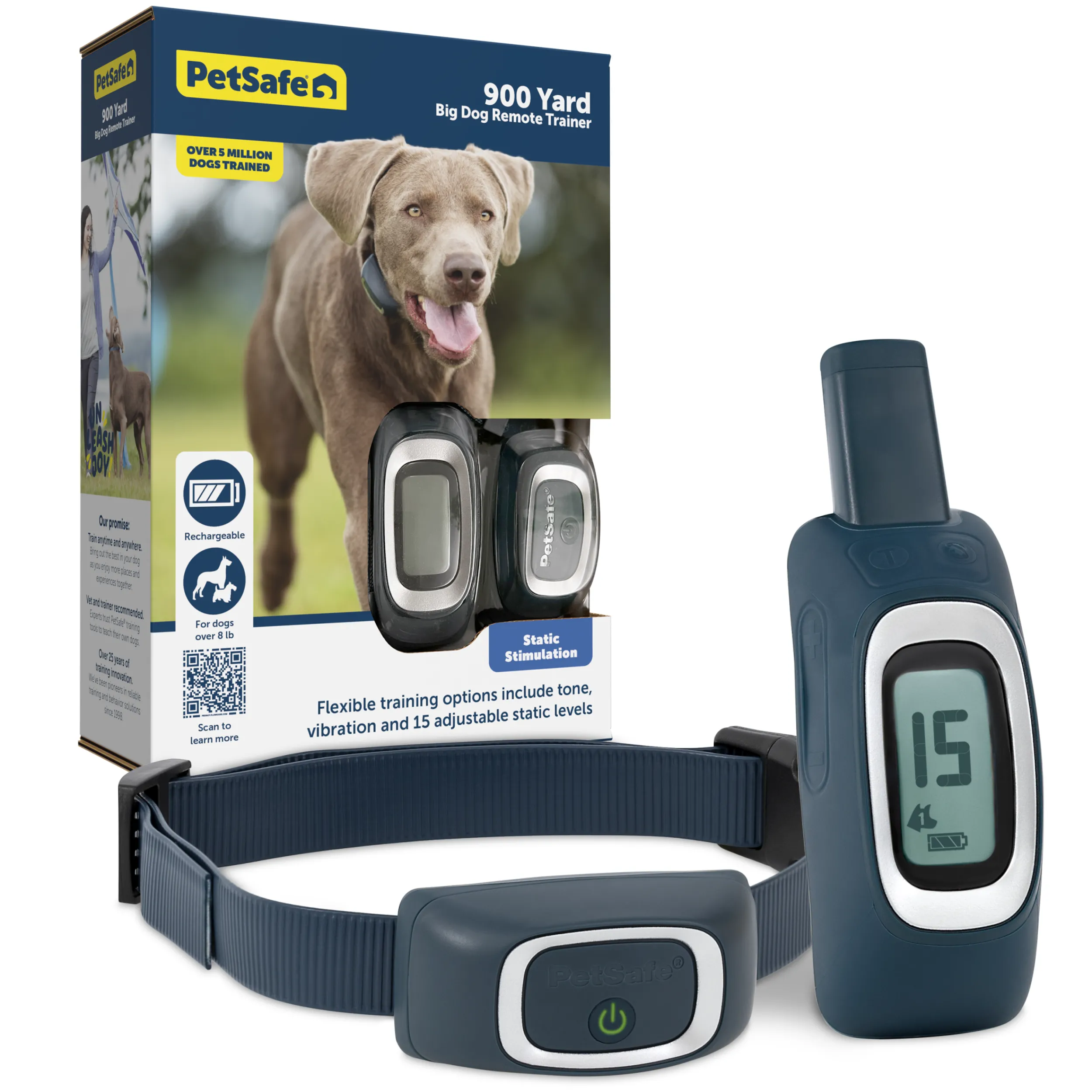 Created for people who go far with their dogs, the 900 Yard Remote Trainer is our longest-reaching trainer. The 900 yard range (that’s basically a half mile) is perfect for dogs who love forging ahead on the trail. With this tool, you can still recall your dog even when he’s far out of sight. The remote fits comfortably in the palm of your hand, and we specifically designed the buttons to be intuitive, so they’re easy to remember and right where you expect them to be. The backlit, large font display is easy to read any time of day or night. This training system is durable enough to survive even your most rugged adventures. The collar is ridged coated polyester (to keep slipping at bay), and the collar and remote are waterproof – perfect for spontaneous jumps in the lake. Your pet deserves the best. Trust PetSafe® to help keep your pet healthy, safe and happy.